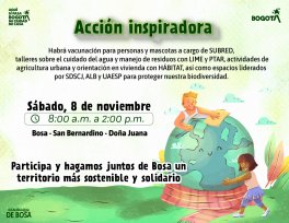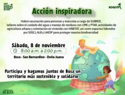 ¡Acción inspiradora en #Bosa! Este sábado 8 de noviembre, te esperamos de 8:00 a.m. a 2:00 p.m. en San Bernardino – Doña Juana para compartir una jornada llena de actividades por el cuidado del ambiente y la comunidad. Habrá vacunación para personas y mascotas, talleres sobre manejo de residuos, agricultura urbana, orientación en vivienda y mucho más. ¡Participa y hagamos juntos de Bosa un territorio más sostenible y solidario!