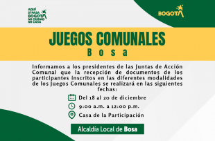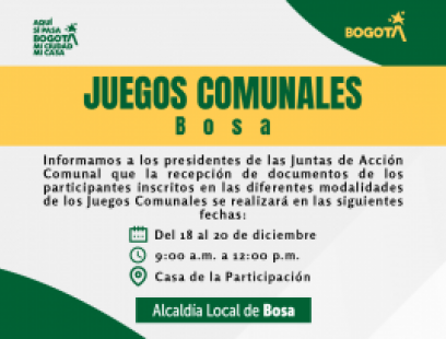 Informamos a los presidentes de las juntos de Acción Comunal que la recepción de documentos de los participantes inscritos en las diferentes modalidades de los juegos comunales se realizará en diferentes fechas