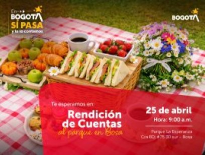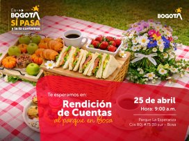 En Bogotá pasan cosas buenas y queremos que tú seas parte de ellas. Te invitamos a nuestra Rendición de Cuentas en Bosa, un espacio para conocer los avances de nuestra ciudad y seguir construyendo juntos. Fecha: 25 de abril Hora: 9:00 a.m. Lugar: Parque La Esperanza (Cra 80j #75 30 sur - Bosa) ¡Tu participación es clave para que en Bosa sigan pasando cosas grandes! #AquíSíPasa #RendiciónDeCuentas #BogotáMiCiudadMiCasa