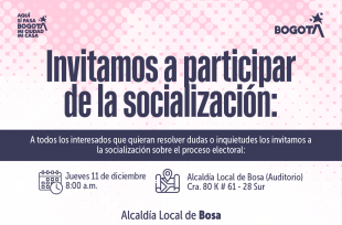 A todos los interesados que quieran resolver dudas o inquietudes los invitamos a la socialización sobre el proceso electoral: FECHA: jueves 11 de diciembre de 2025 HORA: 8:00 a.m. LUGAR: Auditorio de la Casa de la Participación DIRECCIÓN: Carrera 80 K # 61 - 28 Sur