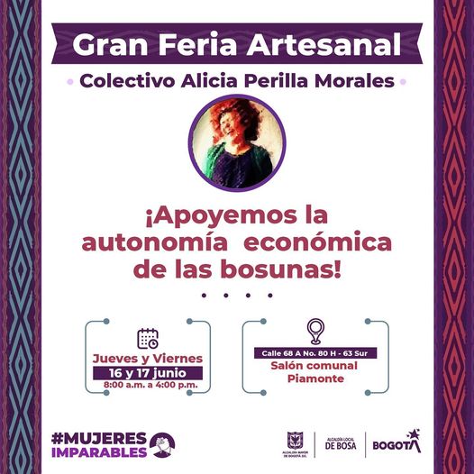 En la Feria Artesanal de #MujeresImparables encontrarás las mejores artesanías de Bosa. Te esperamos a ti y a tu familia para que conozcas los mejores productos, a precios justos. Apoyael talento local, apoya lo nuestro