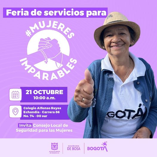 #MujeresImparables de Bosa, traemos una gran feria de servicios para ustedes. Servicios de salud, ofertas laborales, educación, vivienda y atención en el centro escucha LGBTIQ+, estarán en un solo lugar, ¡Las esperamos!