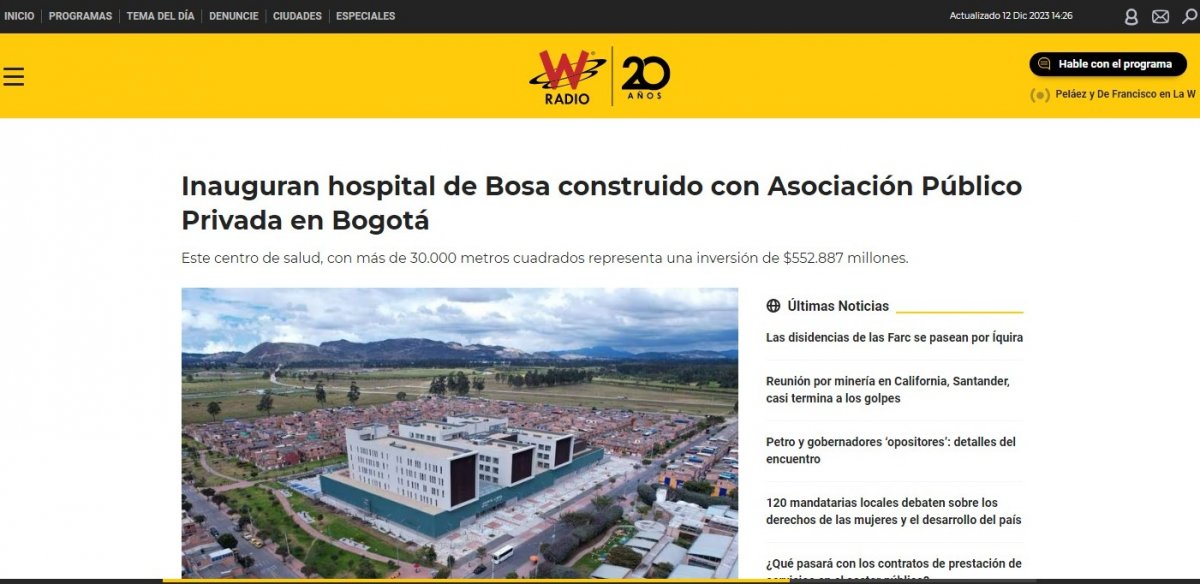 La alcaldesa Claudia López presidió la entrega oficial del nuevo Hospital de Bosa, una obra pionera construida bajo el esquema de Asociación Público Privada (APP) en Colombia. Este centro de salud, con más de 30.000 metros cuadrados, representa una inversión de $552.887 millones y beneficiará directamente a más de 411.000 personas en su área de influencia, así como a aproximadamente 2,5 millones de residentes de las localidades de Bosa, Kennedy, Puente Aranda, Fontibón y el municipio vecino de Soacha.