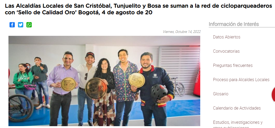 En bicirecorrido realizado por el secretario de Gobierno, Felipe Jiménez, por las localidades de San Cristóbal, Tunjuelito y Bosa, que contó con el acompañamiento de la Secretaría Distrital de Movilidad, se otorgó a las Alcaldías Locales de San Cristóbal, Tunjuelito y Bosa la certificación con ‘Sello de Calidad Oro’ gracias la implementación de sus cicloparqueaderos, los cuales cumplen con las condiciones de seguridad, número de cupos y condiciones de confort para los ciclistas.