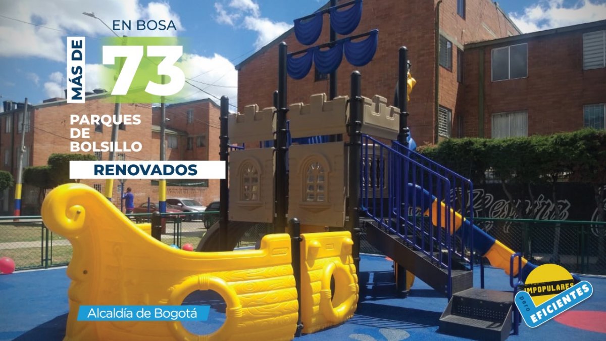 En nuestros renovados parques de bolsillo, los niños y niñas cuentan nuevas historias, se divierten y comparten con sus familias, disfrutando de un mobiliario único. Ya hemos entregado 73, de los 80 proyectos con una inversión de 13 mil millones #ImpopularesPeroEficientes