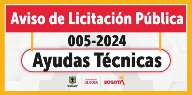 El Fondo de Desarrollo Local de Bosa, en acatamiento a lo previsto en el artículo 2.2.1.1.2.1.2 del Decreto 1082 de 2015, invita a todas las personas naturales o jurídicas, nacionales o extranjeras en forma individual o conjunta (consorcio y unión temporal), que cumplan con todos los requisitos exigidos para el mismo y estén interesados en participar en el Proceso de Licitación Pública FDLBOSALIC 005-2024, que tiene por objeto: “PRESTAR LOS SERVICIOS PARA LA VALORACIÓN, ADQUISICIÓN, OTORGAMIENTO, ENTREGA, ENTRENAMIENTO Y SEGUIMIENTO DE LOS DISPOSITIVOS DE ASISTENCIA PERSONAL – AYUDAS TÉCNICAS, QUE NO SE ENCUENTREN INCLUIDOS EN EL PLAN DE BENEFICIARIOS - PBS, EN LA LOCALIDAD DE BOSA”, así: En cumplimiento al artículo 66 de la Ley 80 de 1993, artículos 1,4,5 y 9 de la Ley 850 de 2003 y el numeral 5 del artículo 2.2.1.1.2.1.5 del Decreto 1082 de 2015, se convoca a todas las Veedurías ciudadanas para que realicen el control social correspondiente a los procesos que realice el Fondo de Desarrollo Local de Bosa.