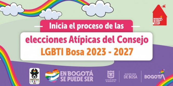 La Alcaldía local de Bosa invita a las personas del sector LGBTI interesadas en participar de las elecciones atípicas del Consejo LGBTI a inscribirse al correo diversidad.bosa@gobiernobogota.gov.co a partir del 24 de febrero hasta el 10 de marzo de 2025.