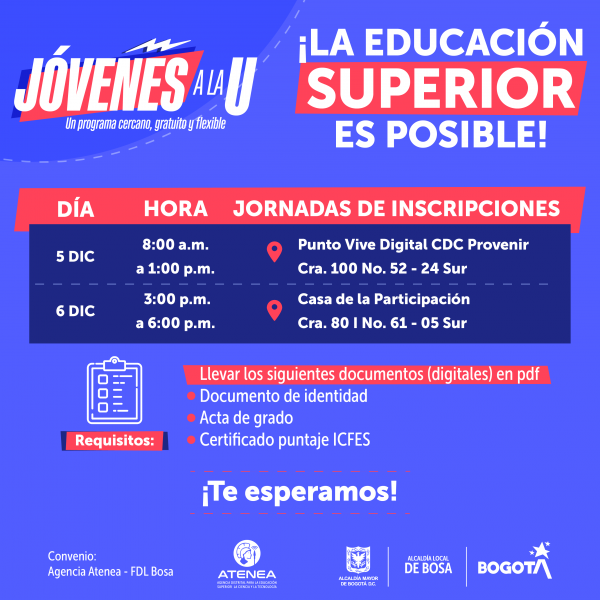 Bogotá 29 de noviembre 2022 | Desde la Alcaldía Local de Bosa y en convenio con la Agencia ATENEA, apoyamos a los jóvenes bachilleres que hayan presentado la prueba Saber 11, que tengan menos de 28 años, que no hayan estado matriculados(as) en un programa de educación superior por lo menos durante los dos últimos semestres antes del inicio de la convocatoria o que no sea egresado(a) de una carrera profesional y que quieran estudiar una carrera técnica, tecnológica o profesional en una universidad de alta calidad de Bogotá, pero no cuenten con los recursos económicos para pagarla, podrán postularse al programa ‘Jóvenes a la U’.