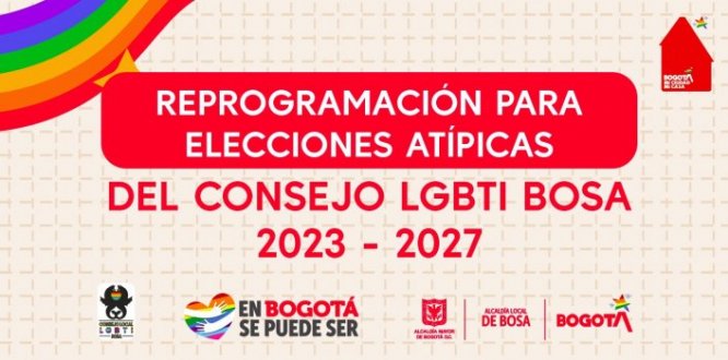 La Alcaldía Local de Bosa, en cabeza del señor alcalde Fabián Ernesto Ramírez Cruz, se permite informar a los candidates, votantes y ciudadanía en general que las votaciones a la elecciones atípicas al Consejo Local LGBTI de Bosa para el período 2023 – 2027 programadas para el día de hoy, 27 de noviembre del presente año, serán reprogramadas, en razón a que líderes, lideresas y organizaciones sociales de los sectores sociales LGBTI manifestaron su inconformidad frente al proceso y en aras de garantizar el mismo de manera transparente y participativa se fijara nueva fecha para adelantar las elecciones atípicas del Consejo Local.