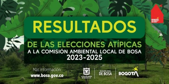 En el marco del proceso de elecciones elección atípica de integrantes no institucionales de la Comisión Ambiental Local de Bosa para el periodo 2023-2025, luego de realizarse la jornada de votaciones llevada a cabo en la Casa de la Participación de Bosa el día 30 de noviembre, para la elección de representantes de sistemas, mesas, procesos territoriales y organizaciones, que realicen y/o promuevan acciones ambientales en la localidad, de representantes de las universidades (públicas o privadas) con presencia en la localidad y estudiantes de un colegio (público o privado) de la localidad, a continuación se presentan los resultados: