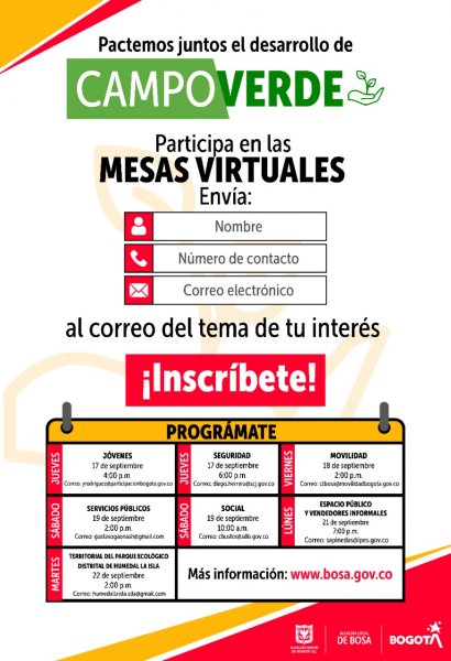 | Ambiental | Secretaría de Ambiente, Jardín Botánico, Alcaldía Local | 22 de septiembre 2020 | 2:00 PM | Virtual |